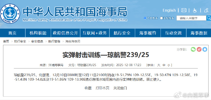 据中国海事局网站消息,洋浦海事局发布航行警告,12月10日8时至12月11日21时,北部湾部分水域进行实弹射击训练,禁止驶入。