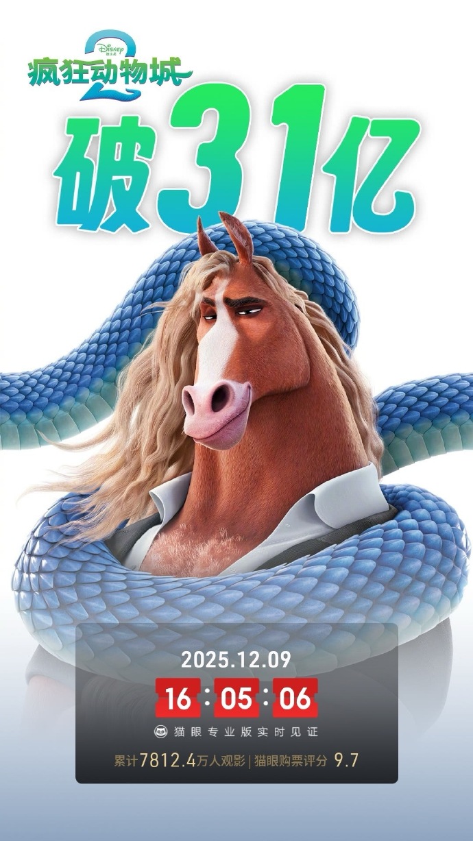 12月9日,据猫眼专业版数据,电影《疯狂动物城2》上映14天,总票房破31亿元。