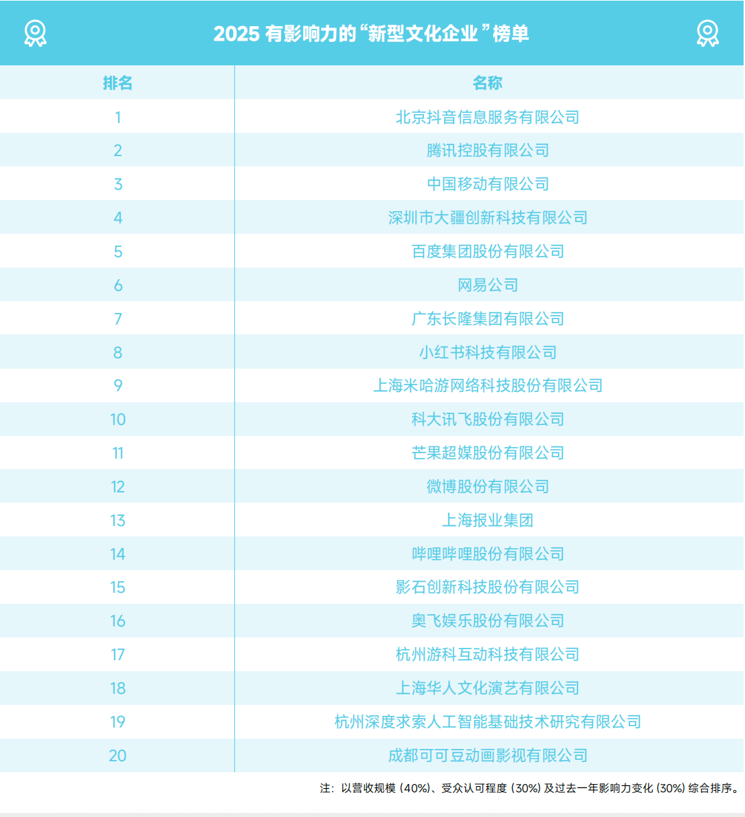 12月8日,在中国文化产业投资(深圳)年会上,中国文化产业投资母基金联合界面智库发布了《2025中国新型文化企业发展态势报告》(以下简称“报告”)及“2025有影响力的新型文化企业”,抖音、腾讯、中国移动、大疆创新等20家企业入选。报告系统梳理了当前中国文化产业的发展现状,深入解析“新型文化企业”的内涵特征与演进趋势,并就加快培育新型文化企业提出了针对性的政策建议。