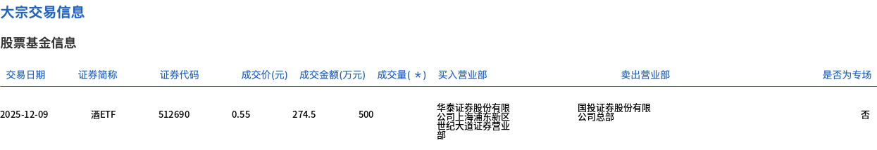 12月9日,酒ETF大宗交易成交500万股,成交额274.5万元,占当日总成交额的0.25%,成交价0.55元,较市场收盘价0.549元溢价0.18%。