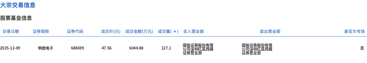 12月9日,明微电子大宗交易成交127.1万股,成交额6044.88万元,占当日总成交额的27.5%,成交价47.56元,较市场收盘价47.56元持平。
