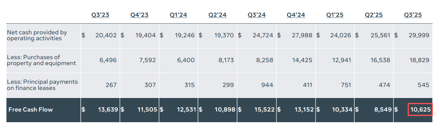 受资本开支增加等因素影响,Meta三季度的自由现金流为106.25亿美元,同比下降超过30%。