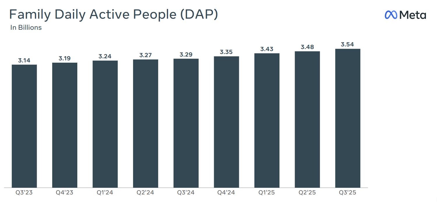 根据最新披露的三季报,Meta家族产品的日活用户(DAP)达到35.4亿,同比增长8%。