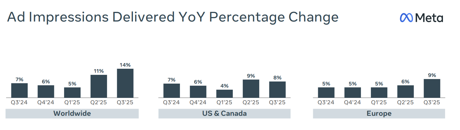 第三季度,Meta广告加载率同比提升14%,其中亚太地区同比提升达23%;广告均价同比上涨10%。