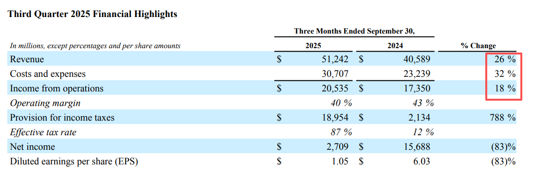 但另一方面,Meta第三季度成本和费用同比增长32%,明显高于同期的营收增速,拖累了公司整体经营利润率。同时,公司预计2026年的资本支出增长将明显大于2025年,引发市场对AI投入产出比的担忧。