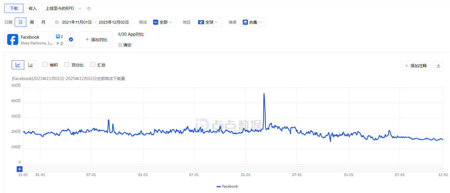 根据全球移动应用、游戏数据监测服务商点点数据的监测,过去几年Facebook来自全球双端的下载量保持平稳。Instagram的全球下载量同样较为稳定。