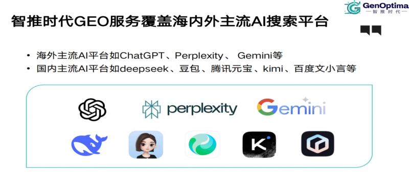 详情:自主研发的GENO系统是国内首个开源GEO服务系统,实现一次性部署,全平台生效的高效运营。已覆盖 DeepSeek、豆包、腾讯元宝、Kimi、百度文小言、ChatGPT、Perplexity、Gemini 等 25 余个国内外主流 AI 平台, 覆盖 65 种语言语言本地化优化, 且能在 48 小时内完成算法与针对客户服务的适配优化 (行业平均水平 1 周左右), 确保品牌信息快速同步至各平台。语义匹配准确度达 99.7%, 支持毫秒级响应 AI 平台的内容调用需求。