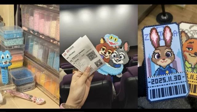 社交平台上,IP爱好者们争相将兔朱迪与狐尼克制作成像素风格的拼豆作品;线下手作店里,年轻人们则用一两个小时,专注地将对狐兔CP的喜爱倾注进一粒粒豆子中,制成专属摆件、创意票根。