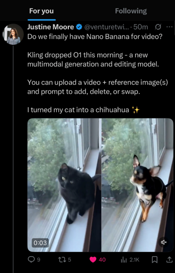 这是可灵O1此行的目标之一,让视频创作正式走向统一的操作系统。其行业价值有一个明确的参考坐标——a16z投资合伙人Justine Moore在产品发布后第一时间点评称:我们终于迎来了视频界的Nano Banana。