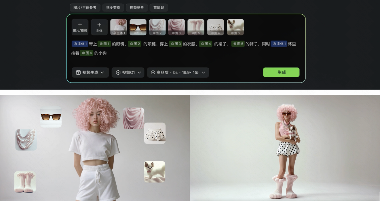 用户上传多角度参考图后,模型可以稳定复现人物、道具、场景——确保在不同任务、不同视频中主体不漂移。这是视频AI真正工业化的前提,因为品牌、IP、影视制作均无法接受核心元素在最终呈现中不是每一帧都一样。