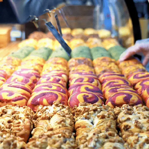 它们大多开在商场负一负二楼能直达地铁的地方,你会因为现烤的香气被吸引到店门口,再略带好奇地排进它门口的试吃队伍中。这些店的产品总是以更吸睛的造型和颜色装满玻璃橱柜,丰富的馅料包括了芋泥、榴莲、抹茶、麻薯等诸多流行食材,宛如往面粉里塞了八宝粥。与之相应的是,它们的单品价格并不便宜,一个碱水面包或蛋挞单价可能超过15元,一块吐司的单价则可能接近30元,而当你排队试吃、排队进店后,会发现连结账可能也要排队。