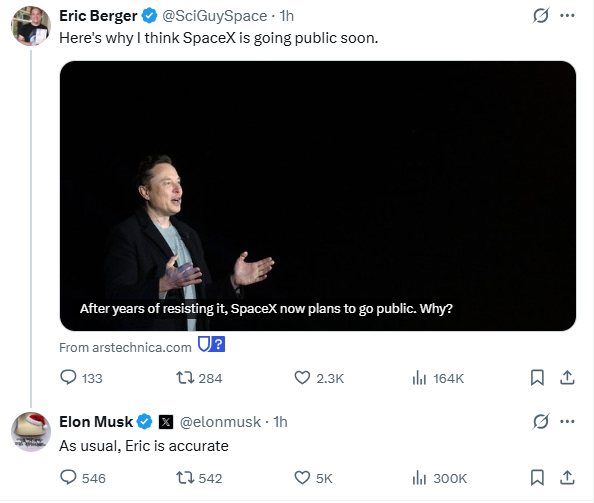 Ars Technica高级太空编辑Eric Berger在一条帖子中写道:“这就是我认为SpaceX很快就要上市的原因。”这篇帖子链接了他在Ars Technica上发表的关于SpaceX上市计划的文章。马斯克回复这则内容称,“和往常一样,Eric是准确的”。