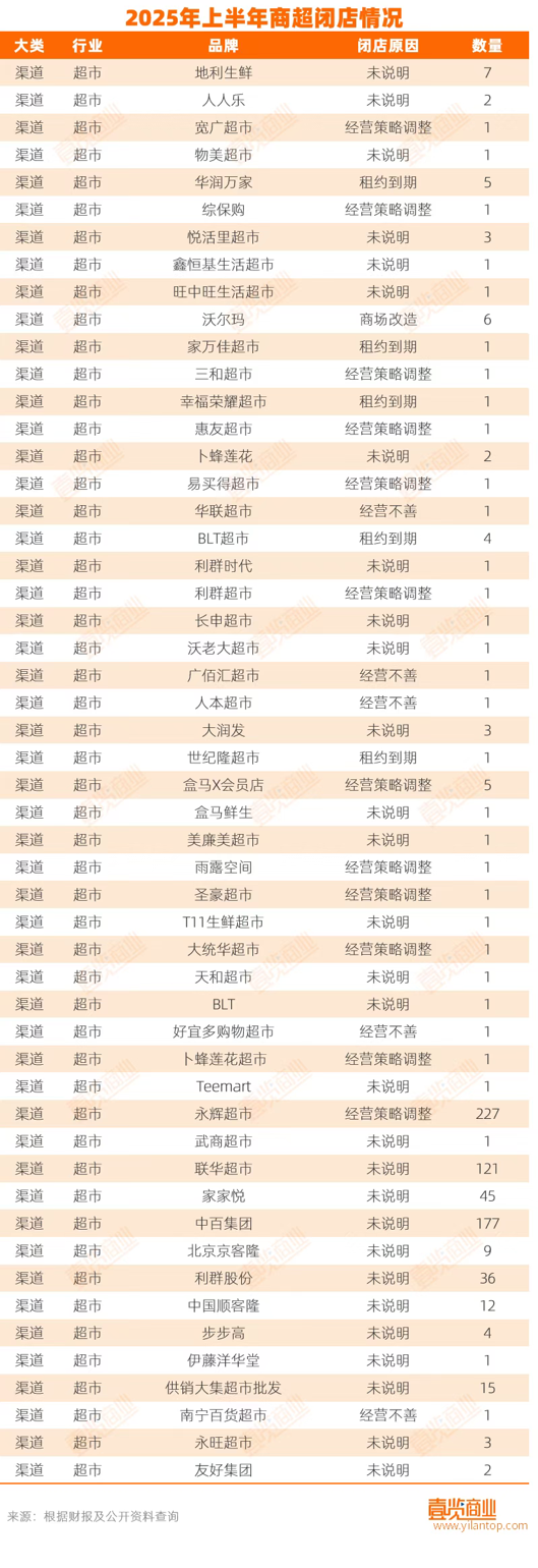 据壹览商业不完全统计,2025年上半年,全国至少有720家超市关门,其中卜蜂莲花、华润万家、永辉超市、大润发等为代表的大模式倒闭之数占据过半。曾经作为中国内地大卖场的领头羊家乐福,中国大陆现仅剩3家门店。