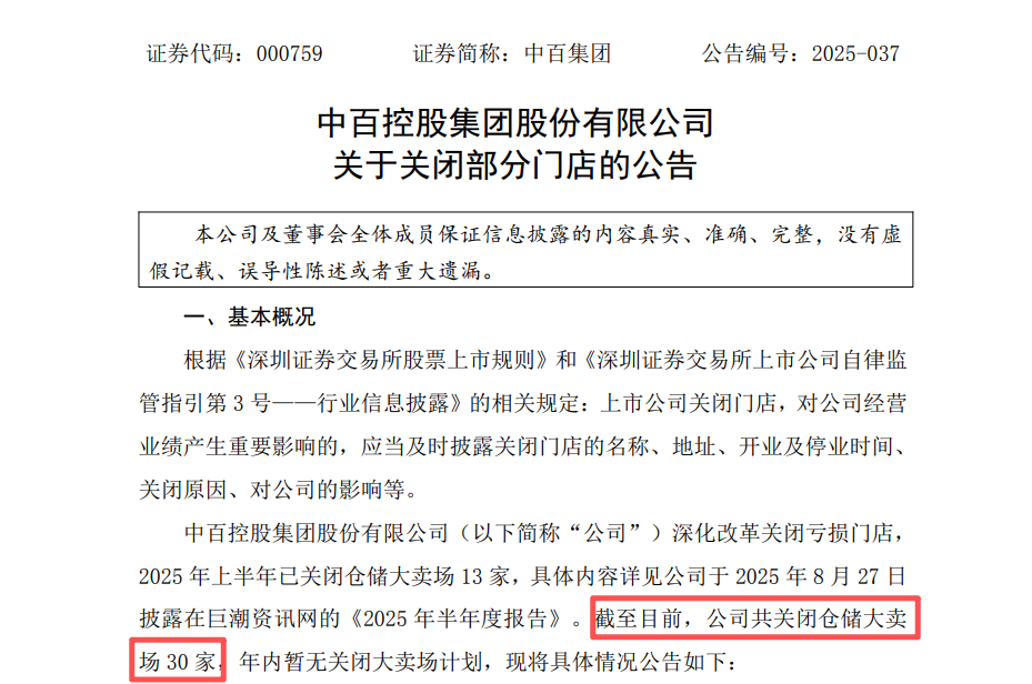 12月4日,中百集团发布公告称,为深化经营改革,已累计关闭仓储大卖场30家,其中2025年上半年关闭13家。在这30家门店中,高达23家因亏损而停业,占比76.7%,仅7家是因合同到期正常关闭,因此次闭店产生的一次性损失预计达1.8亿元。