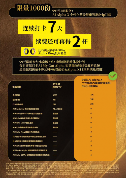 1000位订阅服务消费者将获得:7张“小蛮腰短链脂肪酸酸奶”免费体验券,连续7天,每天解锁1杯(中断即冻结);完整的Alpha X AI健康管理能力,从肠道到营养,从睡眠到虹膜测试,从食材推荐到日常策略,为消费者打造个人健康“数字孪生”;个人化每日教练反馈,身体状态可视化、趋势线、体验曲线图、每日提示——真正做到“你的身体自己告诉你需要什么”;参与Blueglass核心健康系统共创,成为首批AI精准营养系统的开创者,为未来百万用户建立标准。