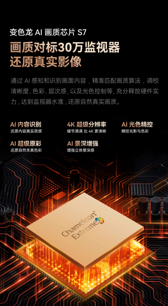 创维黑骑士A6F Pro+变色龙AI画质芯片S7,能精准识别画面内容,智能匹配并优化算法,对标30万监视器级别的“真实画质”,真实还原导演通过画面传递的情绪和内容。
