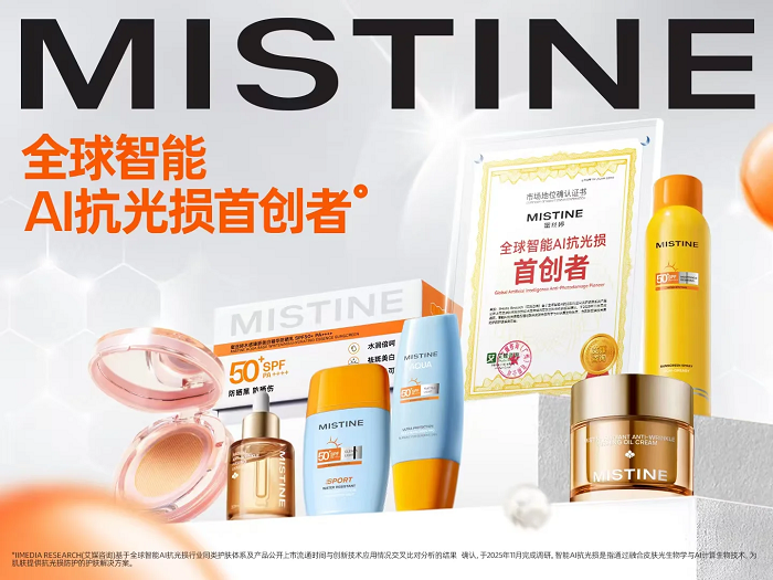 2025年11月,MISTINE蜜丝婷获全球领先的新经济产业第三方数据挖掘和分析机构iiMedia Research(艾媒咨询)授予的“全球智能AI抗光损首创者”市场地位确认。该确认基于艾媒自主研发的省部级重大科技专项CMDAS大数据系统及和AI智能分析引擎,其全球实时数据网络覆盖135个国家和地区、10000+行业细分领域,数据权威性显著。