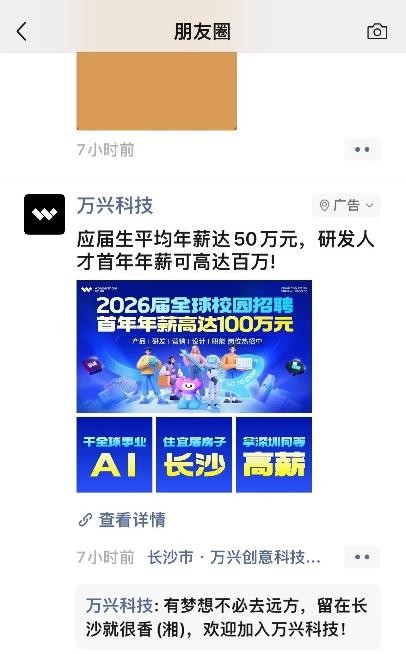 “近期已有候选人成功获得百万年薪录用通知,更多高薪岗位正在火热招聘。我们期待更多优秀人才加入万兴科技,和全球英才一起‘拿深圳同等高薪,住长沙宜居房子,干全球AI事业’。”万兴科技校园招聘相关负责人介绍,此次朋友圈引才广告是万兴科技深化2026届“湘亲湘AI 兴好有你”全球校园招聘的关键环节,公司希望为青年人才提供极具竞争力的薪酬和事业发展平台,助力其在长沙实现事业与生活的双赢。