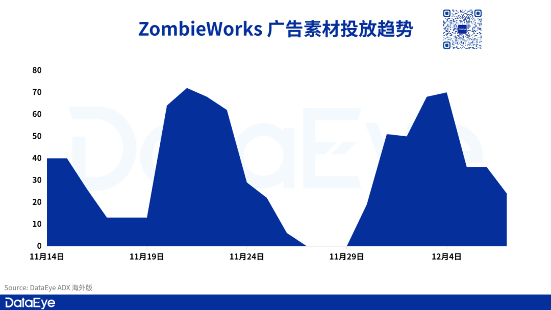 DataEye-ADX海外版数据显示,《ZombieWorks》从11月14日开启投放至今,总投放素材数超过600组,日均投放30组。游戏初期在持续投放了两周时间后暂停过投放,如今再次恢复投放中。