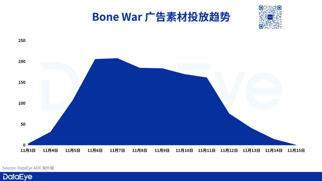 DataEye-ADX海外版数据显示,虽然《Bone War》目前只进行了两周的投放测试,但其素材投放量可不少,总共达到了820组,日均投放素材超过了60组。在第一波的上线测试后,游戏正处于反馈调优阶段。