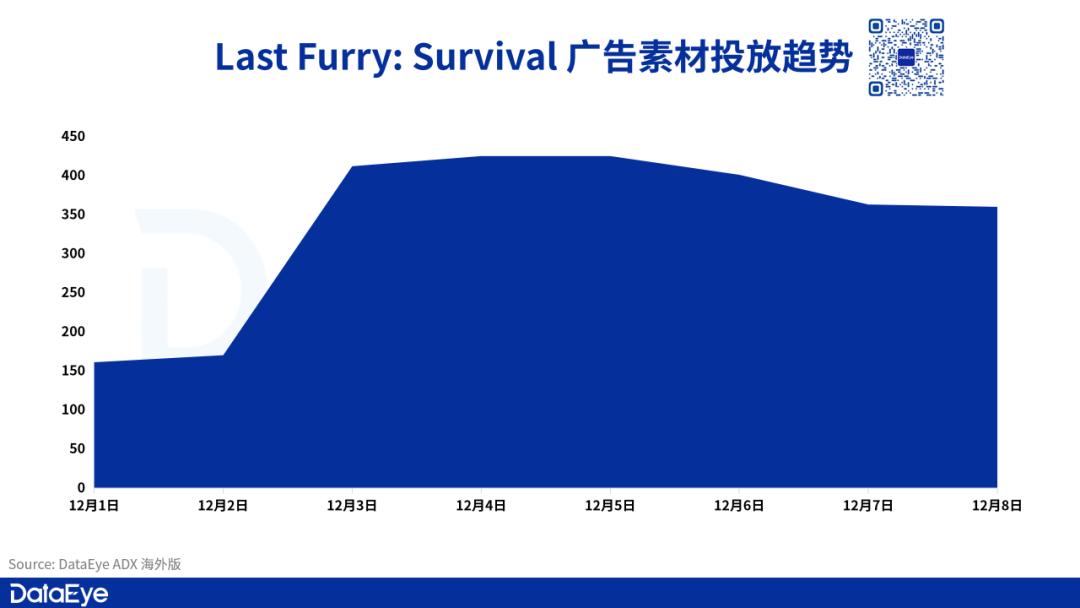 DataEye-ADX海外版数据显示,《Last Furry: Survival》从12月1日开启投放,在短短8天时间内累计投放素材数已经超过1700组,日均投放素材量高达212组,上线即大推,侧面也可能看出星河互娱对于产品完整度的信心。