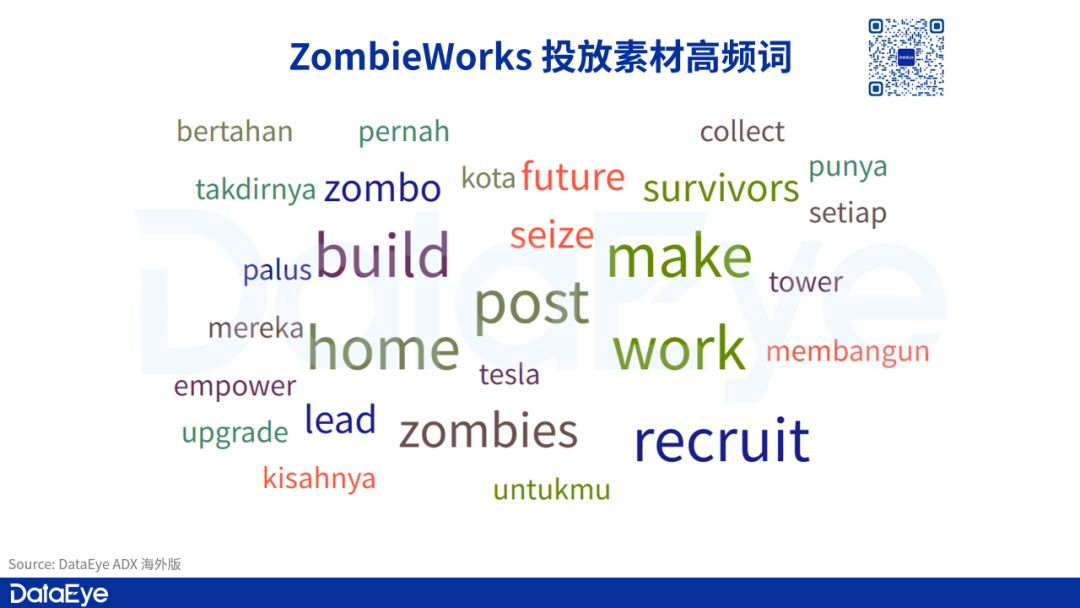 DataEye-ADX海外版数据显示,《ZombieWorks》目前投放的素材以英语和印尼语为主,文案的Top高频词多围绕着「丧尸」「建造」「招募」「家园」等词语展开。