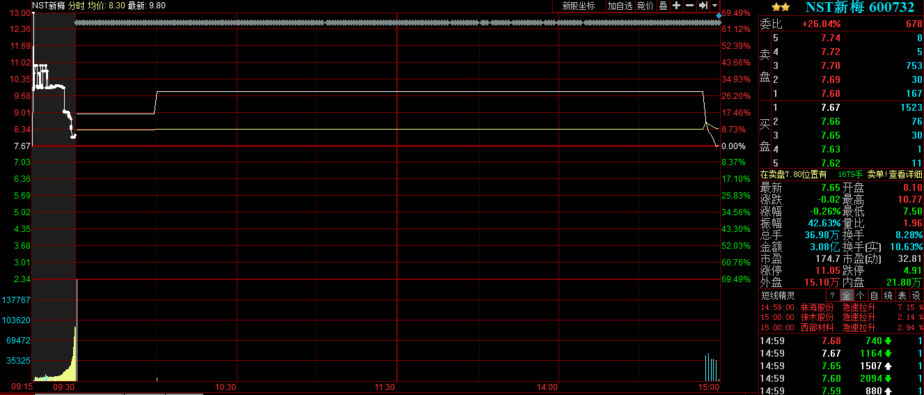 二次恢复交易后,该股行情出现反转。NST新梅股价开始断崖式下跌,最终收盘报7.65元/股,跌0.26%,全天振幅近50%,换手8.28%,成交3.08亿元。