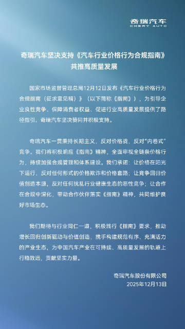 12月13日,@奇瑞汽车 发文称,坚决支持《汽车行业价格行为合规指南》,共推高质量发展。奇瑞汽车一贯秉持长期主义,反对价格战,反对“内卷式”竞争,将积极的响应《指南》精神,全面审视全链条价格行为,持续加强合规管理和体系建设。奇瑞汽车承诺,让价格在阳光下运行,反对任何形式的价格欺诈和价格套路,让竞争回归价值创造本源,反对任何扰乱行业健康生态的恶性竞争,让合作在合规中深化,带动合作伙伴落实《指南》精神,共同维护良好市场生态。