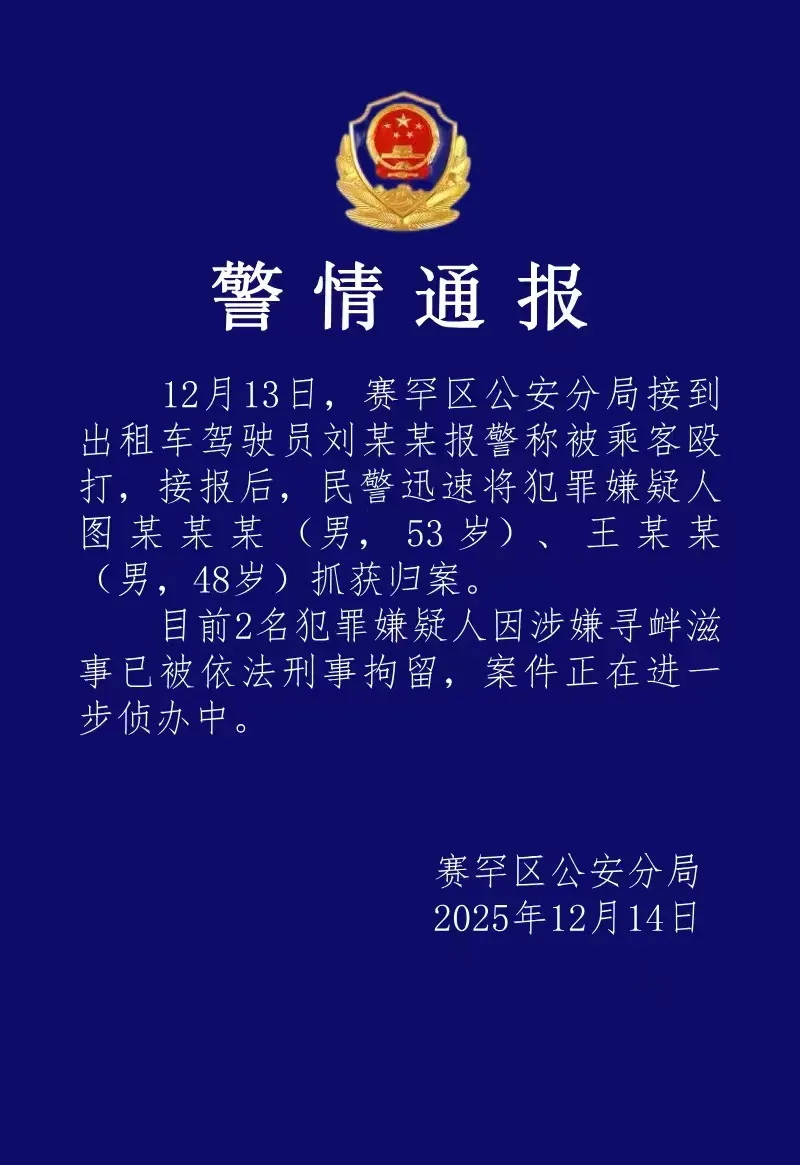 12月14日,内蒙古呼和浩特赛罕区公安分局发布警情通报:12月13日,赛罕区公安分局接到出租车驾驶员刘某某报警称被乘客殴打,接报后,民警迅速将犯罪嫌疑人图某某某(男,53岁)、王某某(男,48岁)抓获归案。目前2名犯罪嫌疑人因涉嫌寻衅滋事已被依法刑事拘留,案件正在进一步侦办中。