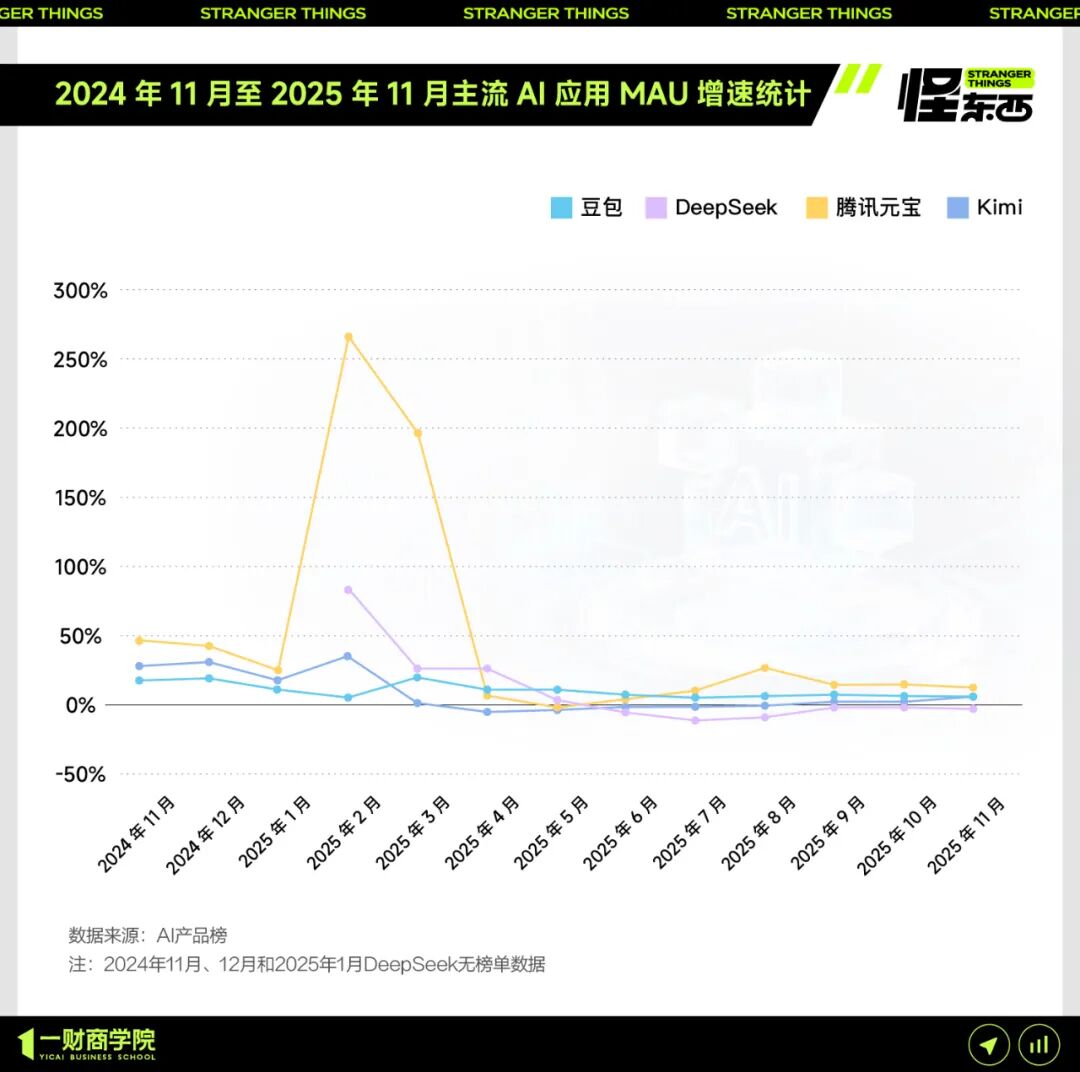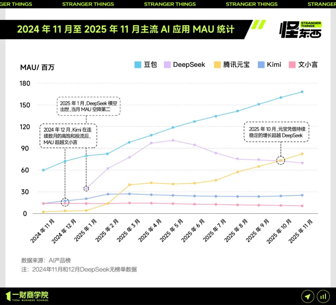 一财商学院盘点了2024年11月至2025年11月国内5家AI头部应用的月活跃用户规模数据(MAU),可以发现第二名的三次易位分别发生在:在2024年12月,Kimi超越文心一言;2025年1月,DeepSeek空降第二超越Kimi;2025年10月,腾讯元宝反超DeepSeek。