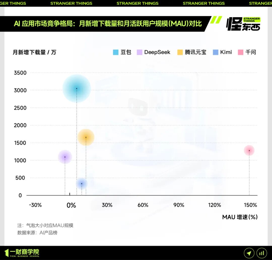 如今,豆包新增下载量、MAU高,兼具规模与增长优势;元宝与DeepSeek处于中间区域,增长与规模相对均衡;Kimi的月活跃用户规模和新增下载量都略显乏力。