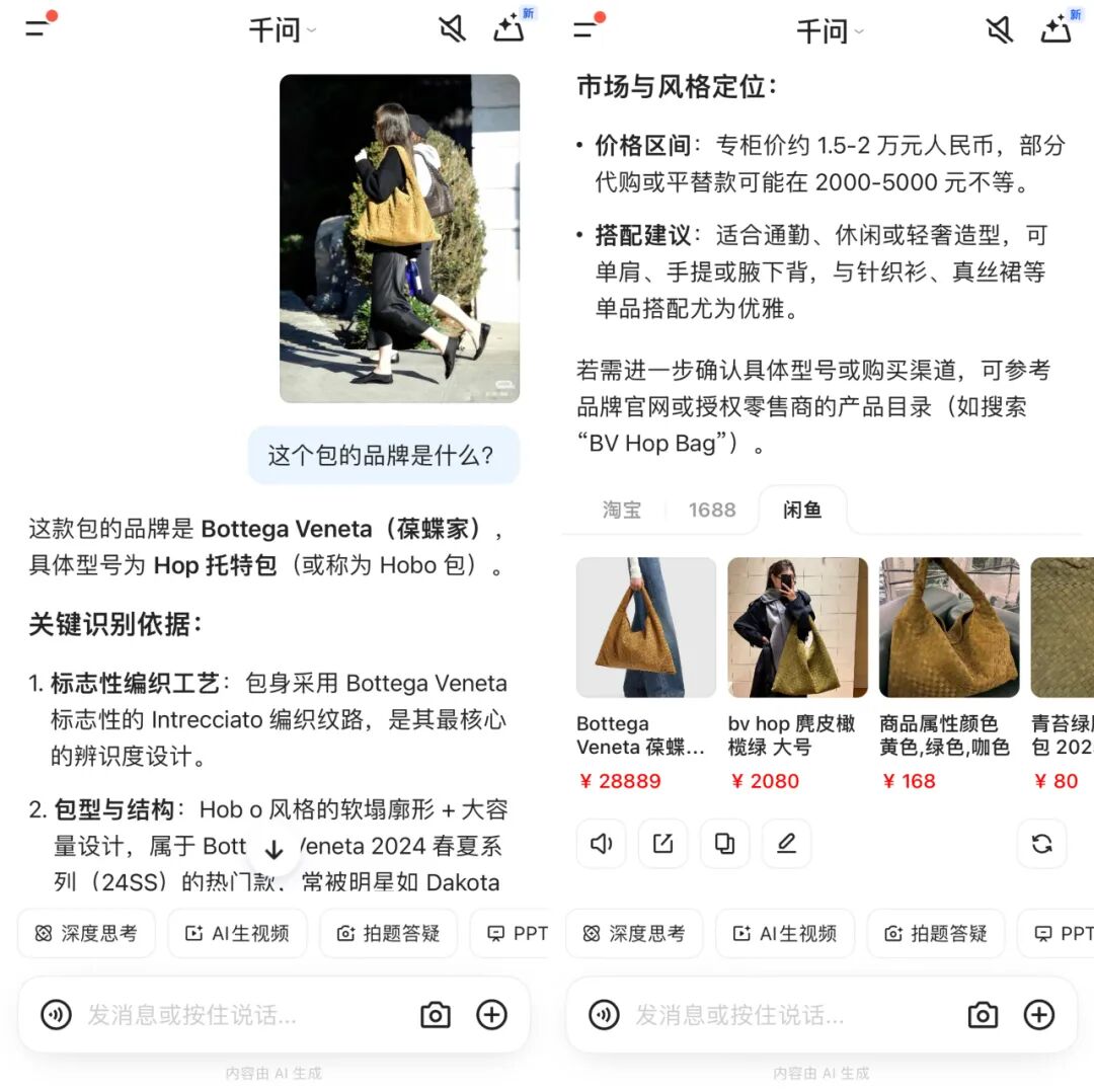 如今的千问,在同水平大模型技术下,比1月的DeepSeek更具生态优势;在几个同样具备生态优势的大厂中,千问背后的阿里业务版图更广,场景更多,可提供的服务更多。例如,其识图功能不仅能准确识别物体,还会自动挂上淘宝、闲鱼、1688的商品链接,将AI能力转化为“一站式”的闭环服务。