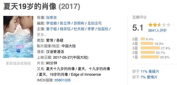 当然,对已于5月27日上映的《夏天19岁的肖像》而言,是否如制片人所言口碑很好,相信看过的观众都有一个自己的打分。参考豆瓣,这部电影只有5.1分,虽然集结了青春、爱情、悬疑三大看点,却因无一出彩而遭观众放弃。其实,在读娱君看来,正如《摔跤》的峰回路转,影片的质量始终是让观众乐意奉上口碑和票房的王牌,而作为制作发行过多部作品的资深制片人以及其背后的大盛国际,自是对此有更透彻的了解。19岁,确实属于每一个人,但是,康桥的19岁可能仅属于他自己,而他的爱情也并非值得一个19岁的少年去不顾一切的在自己的青春里留下一道痕迹。