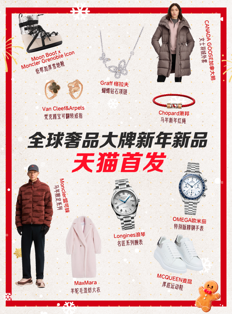 26早春的潮流趋势也已经登陆天猫。MaxMara推出了羊驼毛混纺泰迪熊大衣、高领夹克等一批2026早春新品,加拿大鹅CanadaGoose发售Montgomery羽绒外套。鞋履方面,麦昆Alexander McQueen上线新品渐变黑白仿水晶尾厚底阔型运动鞋,Moon Boot x 盟可睐Moncler联名推出限量款Grenoble lcon金色低帮雪地靴。刚刚官宣入驻天猫奢品的法国设计师品牌ALAÏA,将在双旦期间陆续开售芭蕾舞鞋、Pile羊毛卡班夹克等鞋履、成衣、配饰。