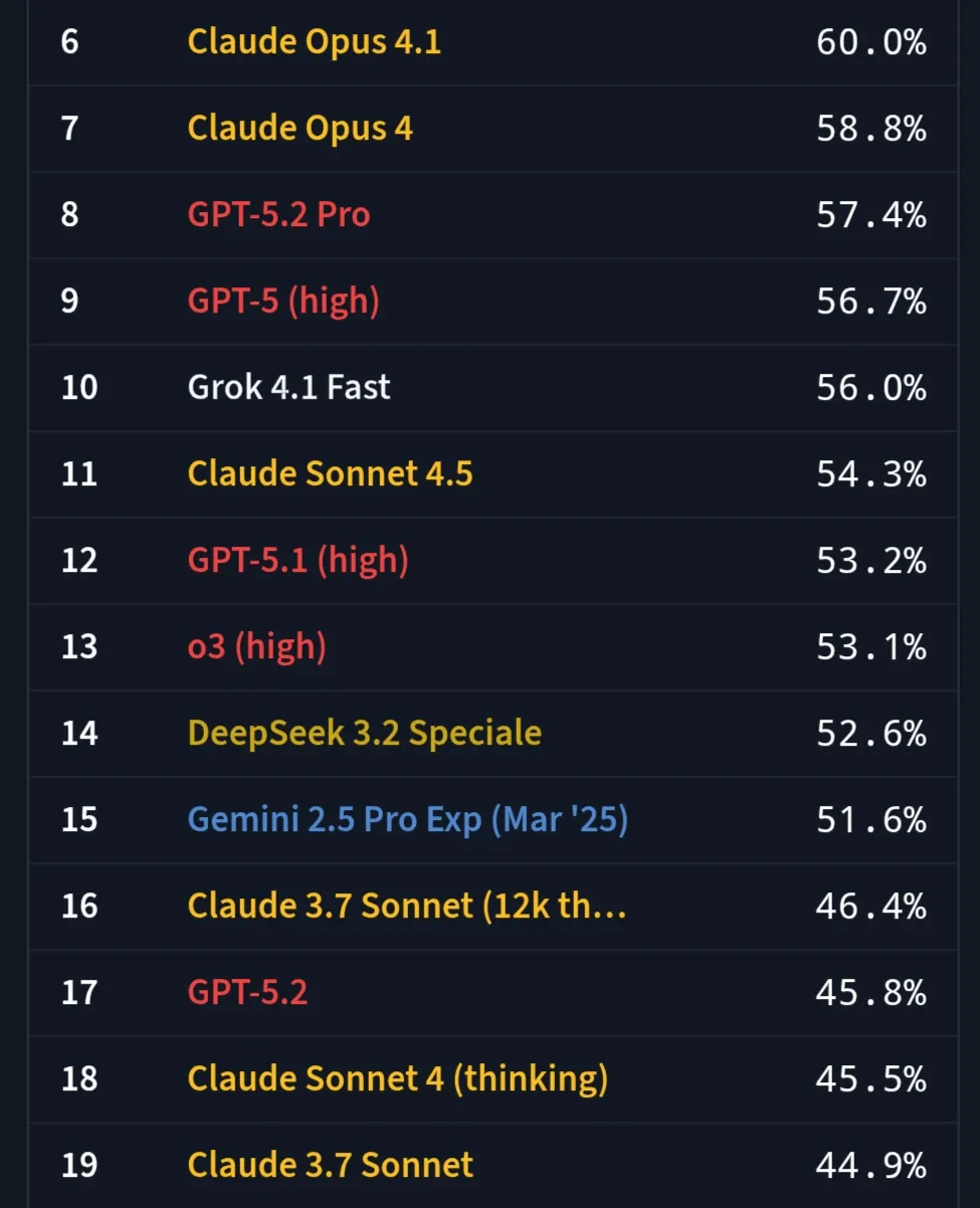 SimpleBench常识推理测试显示,GPT-5.2得分低于Anthropic发布的Claude Sonnet 3.7,甚至在“garlic有几个r”的基础问题上反复出错——有用户三次测试仅一次答对,而谷歌的Gemini 3.0等竞品均稳定通关。该测试旨在评估大模型在处理普通人认为简单,但对机器而言充满挑战的逻辑推理任务的能力。前AWS总经理Bindu Reddy直言,“不值得从GPT-5.1升级”。