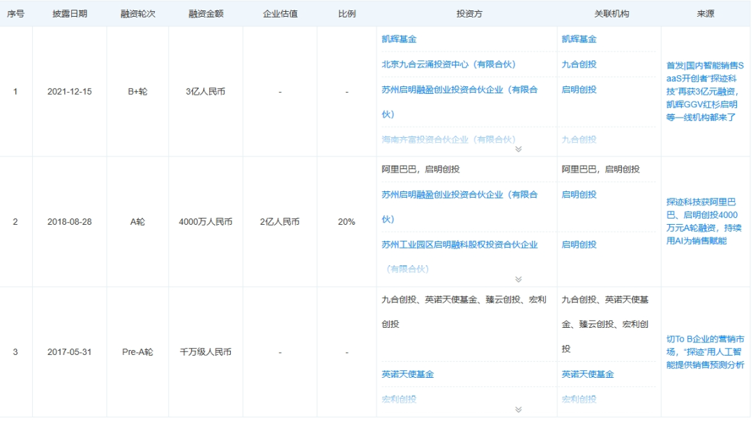 天眼查显示,探迹科技成立之后曾有过3次公开融资,累计融资约5亿元,其资方包含阿里巴巴、红杉中国、九合创投、启明创投等明星机构的身影。