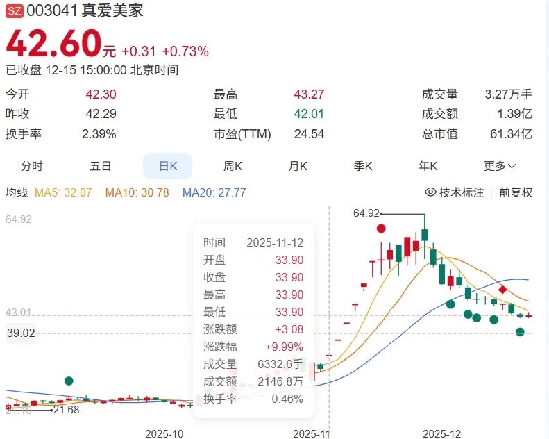 公告发出后,真爱美家股价连续多日上涨,半月之内涨幅近100%,股价从30元出头涨到最高64.92元/股;截至12月15日,真爱美家报收42.6元/股,市值61.34亿元。