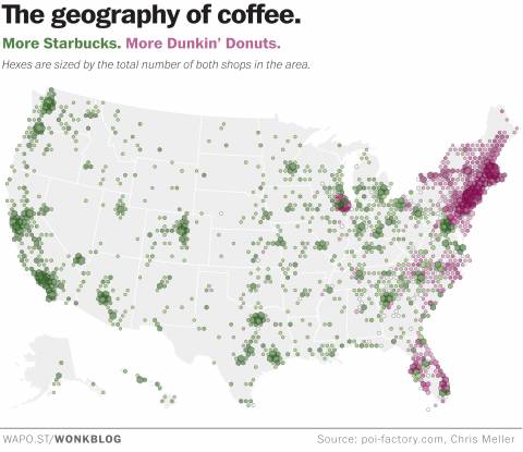 虽说起美国咖啡,大家最先想起的就是 Starbucks,但事实上,东海岸人民更喜欢喝的是Dunkin' Donuts的现磨咖啡; Starbucks在太平洋沿岸则是更为普遍,尤其是它的诞生地——西雅图附近。别以为Dunkin' Donuts只是吃甜甜圈的,可以试试他们家的咖啡。