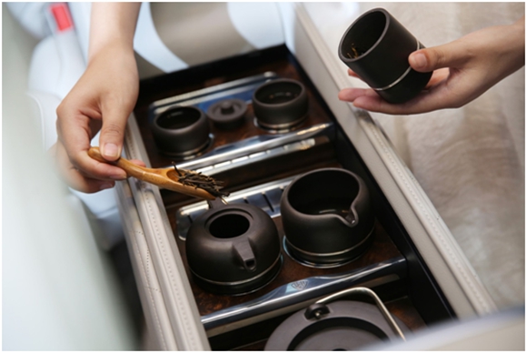 当后排中央扶手隔板向下自动打开,知礼茶席优雅升起后,客户可通过触摸屏在普洱茶、红茶及乌龙茶三种茶品精粹的烹煮模式中选择最适合的品鉴水温。沏一杯沁人心脾的香茗,静心独坐,亦可以茶礼客,谈天论道。