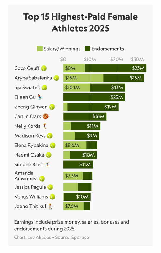 尽管乒乓球运动员代言活跃,但若具体到收入金额,结合职业网坛的高额奖金和个人代言收入,网球运动员仍略胜一筹。美国体育财经媒体《Sportico》于12月发布了2025年世界前15名女子运动员收入榜单。其指出,几十年来,世界收入最高的女运动员的顶级联赛均以网球为主。榜单中的15名女运动员中,有10名是网球运动员,榜首由美国网球新星可可·高芙占领。