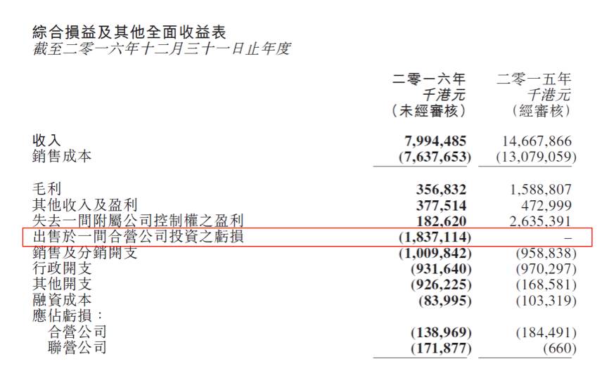 财报数据显示,2016年集团营收79.94亿港元,仅相当于2014年巅峰时期的五分之一,即便扣除去年两家附属公司不再并表的影响,跌幅也相当可观。