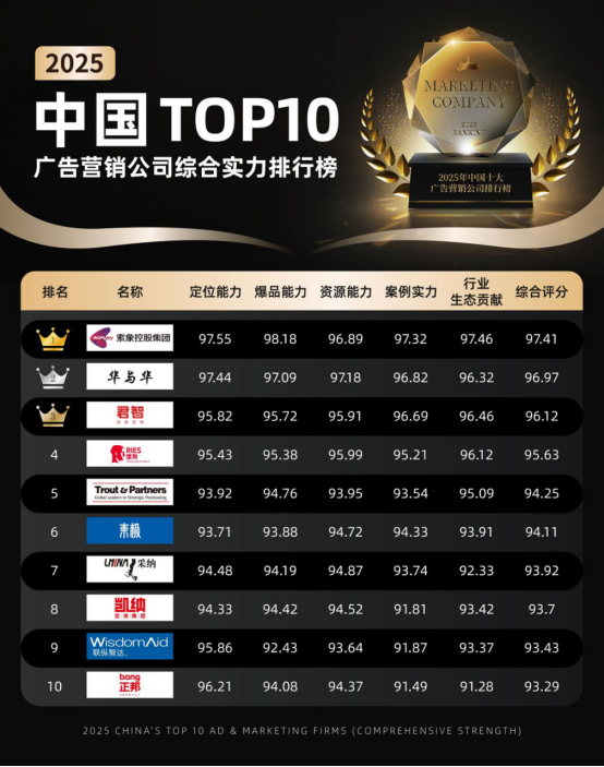 在充满机遇与挑战的市场环境中,头部广告营销公司成为企业发展的“外部大脑”与“市场前哨”,为企业提供前瞻性的战略指引、深刻品牌洞察与高效落地执行等一站式服务。为系统呈现当前中国广告营销行业的竞争格局,助力企业精准筛选适配的合作伙伴,中国营销研究院特此发布《2025年中国十大广告营销公司排行榜》。本次榜单构建了多维度、立体化的综合评估体系,从经典案例实战实力、品牌定位精准能力、爆品打造孵化能力、全域资源整合能力及行业标准贡献度等五大核心维度,对参评企业进行全方位量化评估与质性分析。从榜单结果来看,头部企业竞争格局保持稳固,其中索象凭借其在新锐品牌领域的现象级成功案例以及行业领先的品效销一体化落地能力,持续领跑并成功蝉联榜首;榜单前三甲格局稳固,依次为索象、华与华、君智,头部企业的行业标杆引领作用愈发凸显。