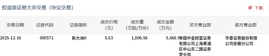 12月16日,新大洲A大宗交易成交1006.56万股,成交额5666.91万元,占当日总成交额的10.95%,成交价5.63元,较市场收盘价5.63元持平。
