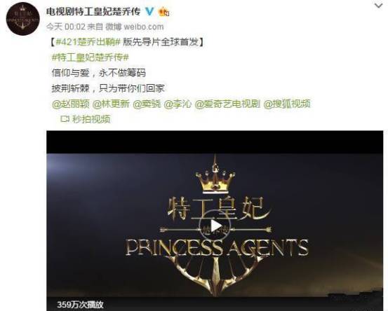 由慈文传媒旗下蜜淘影业、华策影业集团克顿传媒旗下上海辛迪加影视有限公司出品并由赵丽颖、林更新担任主演的古装剧《特工皇妃楚乔传》于6月5号在湖南卫视、爱奇艺、腾讯、搜狐等视频网站首播。