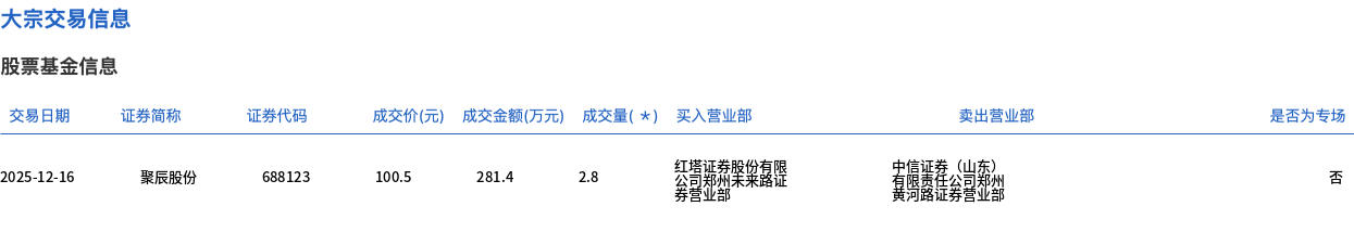 12月16日,聚辰股份大宗交易成交2.8万股,成交额281.4万元,占当日总成交额的0.58%,成交价100.5元,较市场收盘价122.6元折价18.03%。