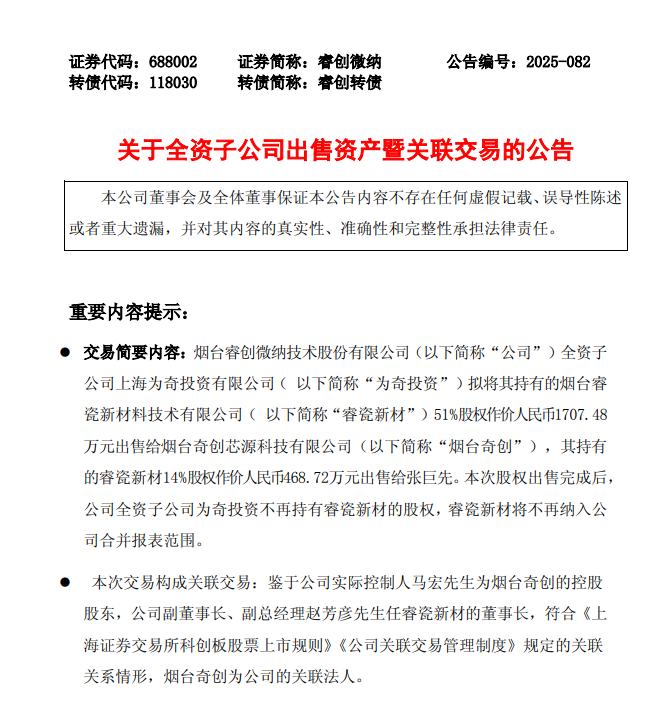 公告显示,为奇投资拟将其持有的睿瓷新材65%股权进行拆分出售。其中,51%股权作价1707.48万元出售给烟台奇创,其持有的睿瓷新材14%股权作价468.72万元出售给张巨先。交易完成后,为奇投资不再持有睿瓷新材的股权,睿瓷新材将不再纳入公司合并报表范围。