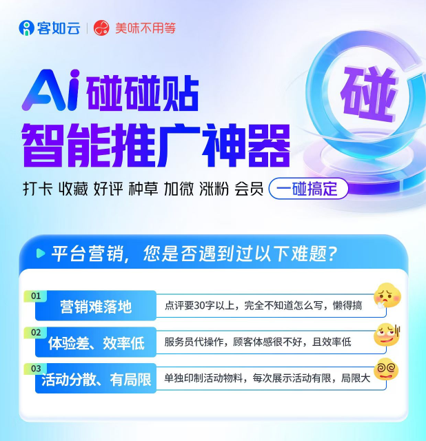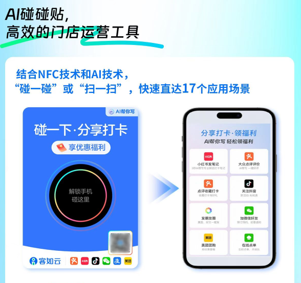 为此,客如云今年推出智能推广神器——“AI碰碰贴”。它融合NFC与AI技术,用户只需轻轻一碰,打卡、收藏、好评、种草——即刻搞定!