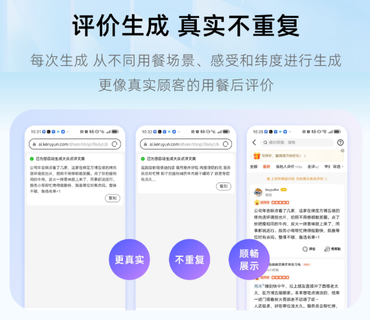 系统内置专业的文案库模型,能够基于不同用餐场景、体验维度及消费感受,生成贴近真实用户口吻的评价内容,有效避免模板化与重复性,更有活人感。生成后的文案仍支持顾客自主修改与调整,例如:增加表情、简短一点、完全重写等,充分融入顾客的个人风格,使每一次分享都更具有可信度。