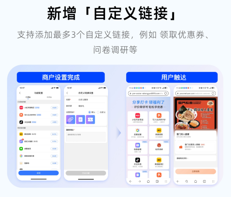 同时,允许添加最多3个自定义链接,便于引导顾客领取优惠券、填写问卷等等。此外,还支持接入最多3个团购套餐,进一步拓展线上线下融合的营销场景。更值得一提的是,客如云的“AI碰碰贴”还提供数据支撑功能,所有功能的使用数据均支持小时级准实时统计与分析,帮助商家精准评估推广效果,敏捷优化运营策略。