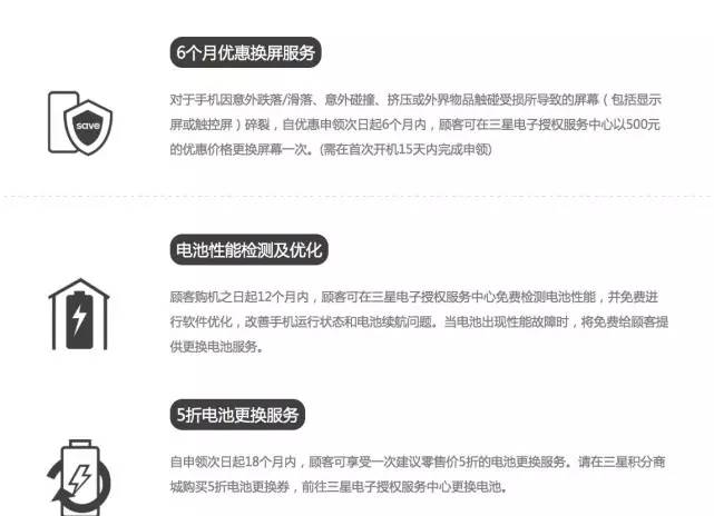 最后则是售后便捷性。当下非国行版,在国内并不能享受三星的保修政策,而国行版本,此次三星在保修政策方面则是显得非常给力的。在三星国行发布会上推出了三星专属管家服务,其内容包含6个月优惠换屏服务、电池性能检测及优化、5折电池更换服务、VIP专属热线以及绿色通道服务五个方面。